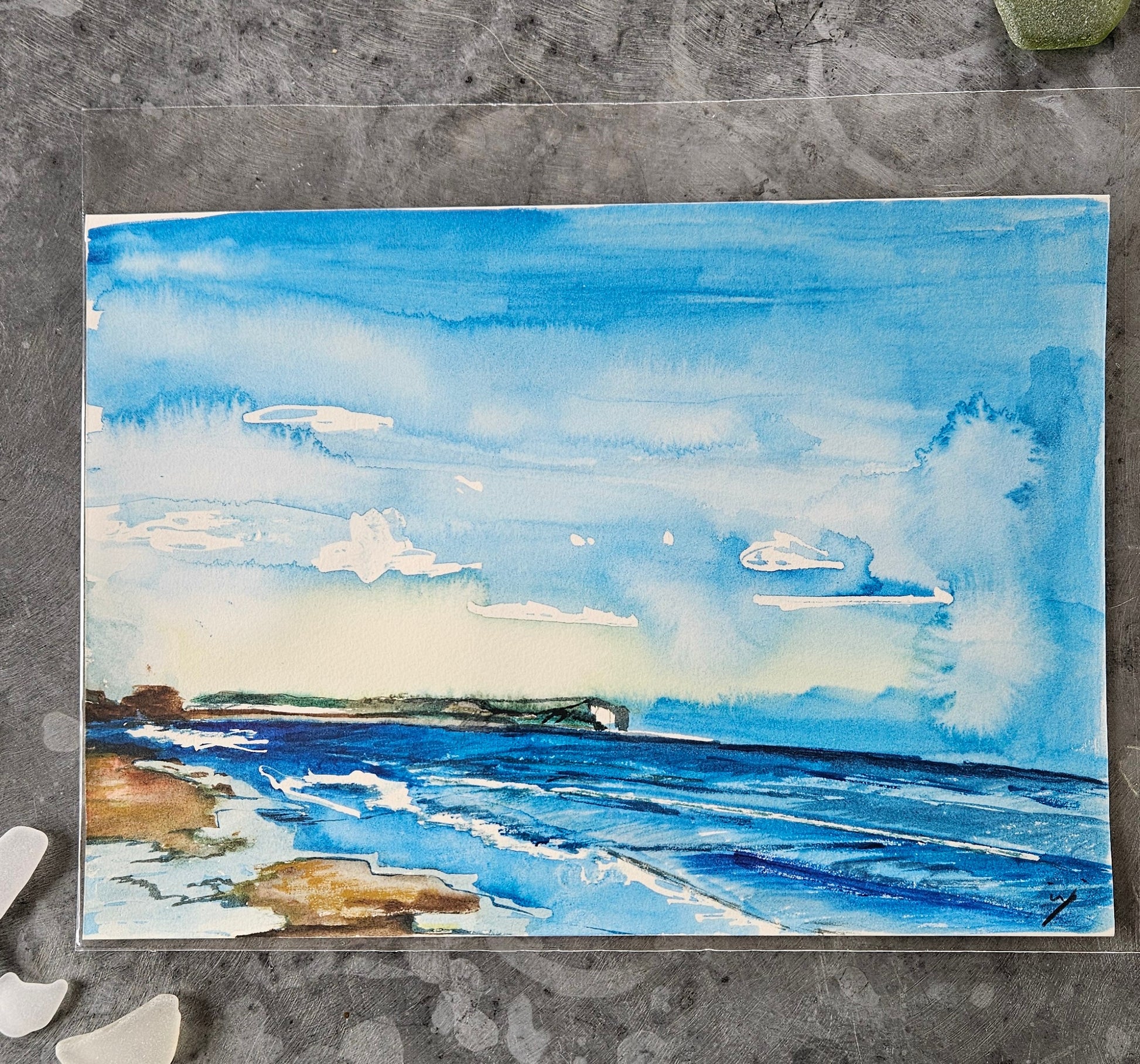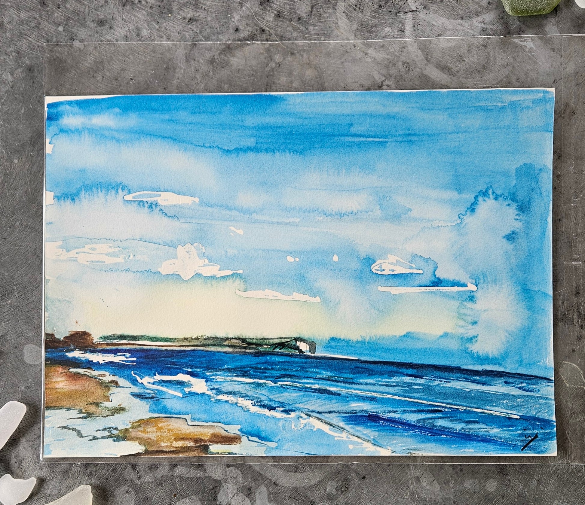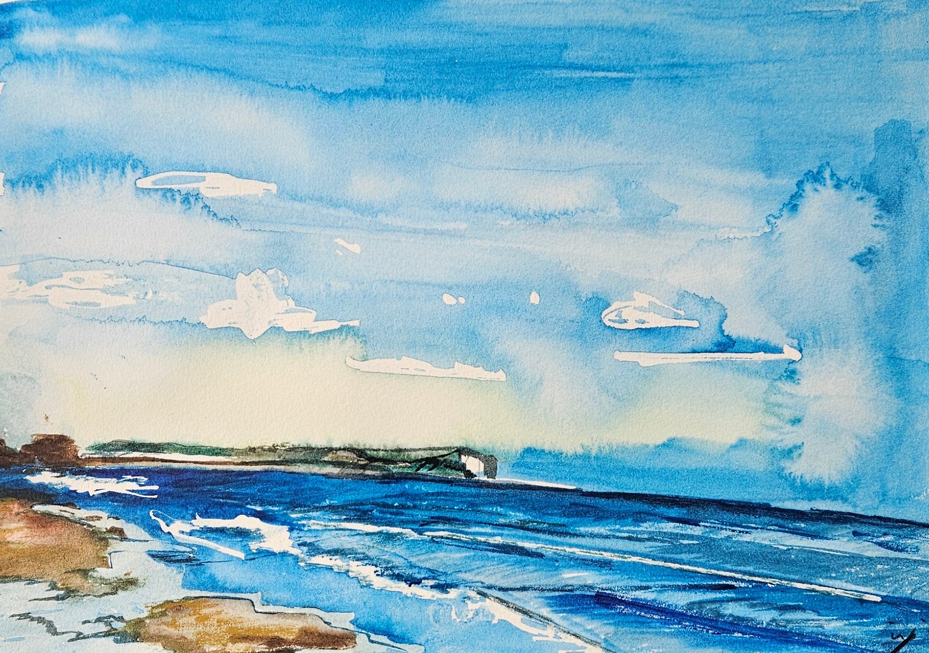 A watercolour painting depicting the blue sea and sky on a sunny day in Bournemouth in May.