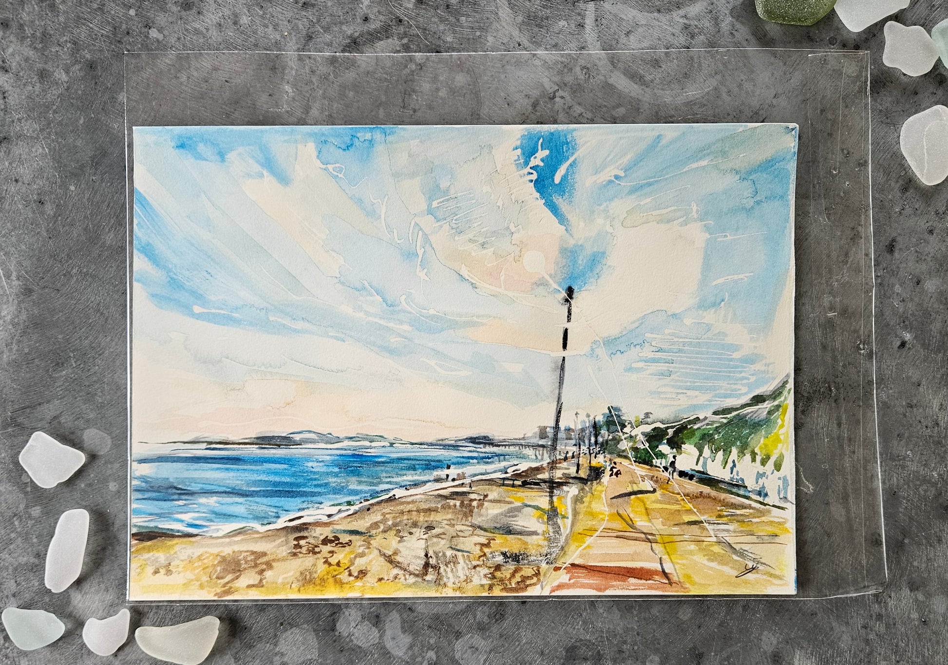 An unframed watercolour of sunshine on Bournemouth beach with Swanage in the distance.