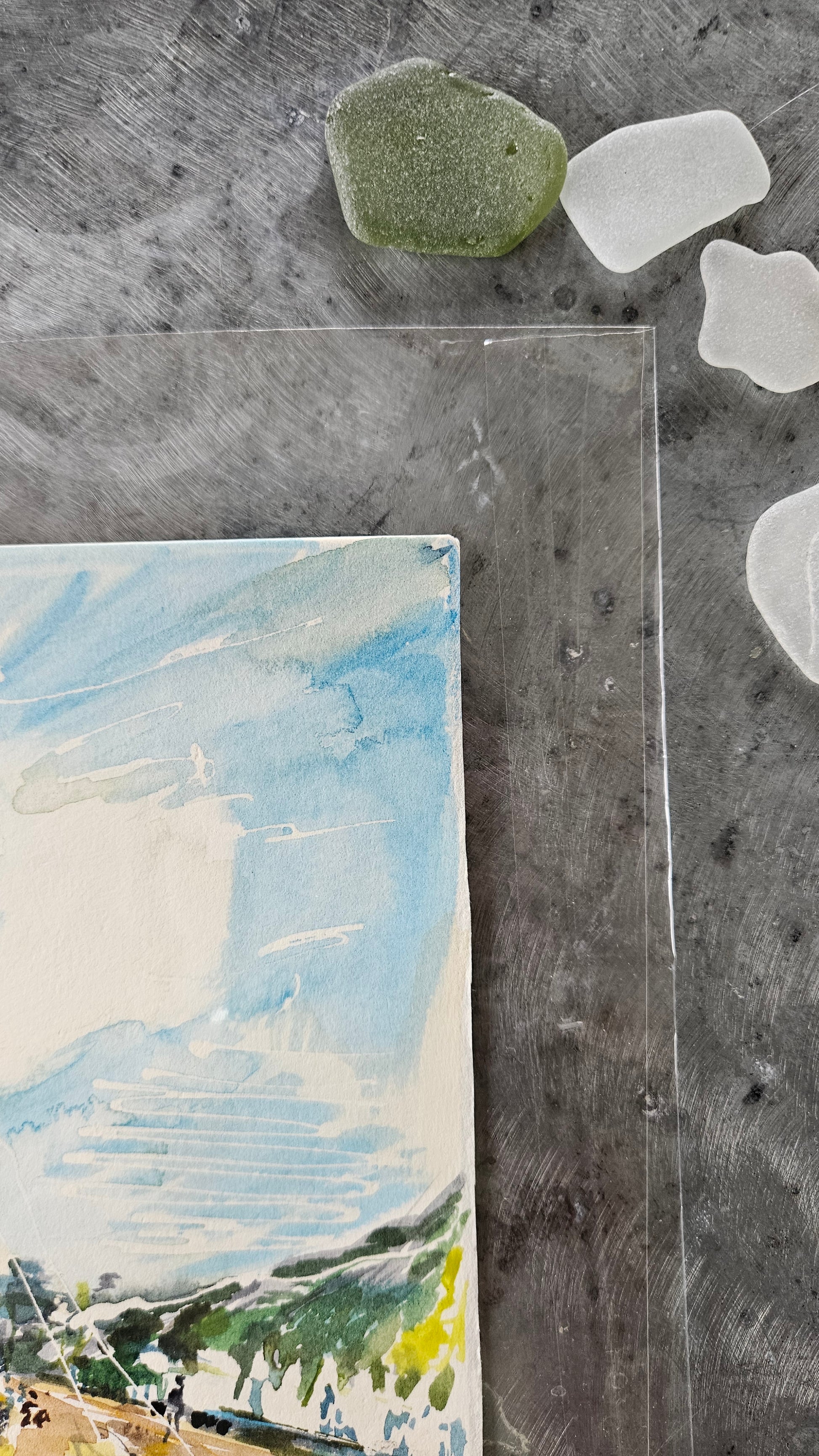 A watercolour depicting the sunrise at Boscombe beach with Hengistbury Head in the distance.